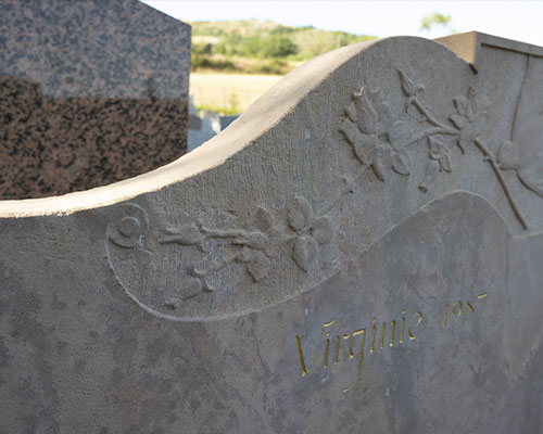 La Marbrerie Fabre-Bony possède une solide expertise dans la gravure et la sculpture de stèles et de pierres tombales. Nous vous proposons un grand choix de polices de caractère et une large palette de couleurs, du blanc à l’or et du bordeaux à l’argent. Nous vous guidons et vous accompagnons dans vox choix, afin que vous puissiez personnaliser le monument funéraire de votre défunt, par exemple à travers une épitaphe ou un motif.